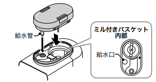 ミル付きバスケットが確実に取り付けられていることを確認し、本体ふたの給水管をミル付きバスケット内部の給水口にまっすぐ差し込みます。本体ふたとミル付きバスケットの向きを合わせて、“カチッ ”と音がするまでしっかりと押し込んでください。