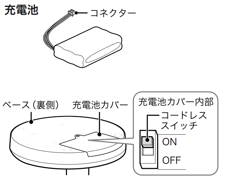 コードレスで使用するときは、充電池が取り付けられていることを確認し、コードレススイッチを「ON」にしてください。