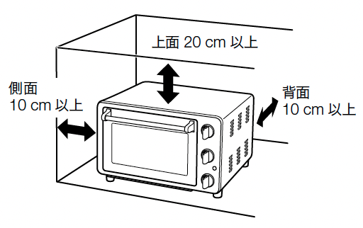 火災を防ぐため、壁や家具からは、側面10cm、後面10cm、上面20cm以上離して設置してください。