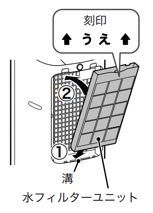 水フィルターユニットは下図の刻印がある面を手前側にして取り付けてください。水フィルターユニットの向きが間違っていたり、正しく取り付けられていない場合は、電源を入れることができません。