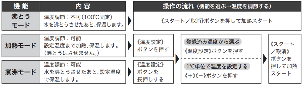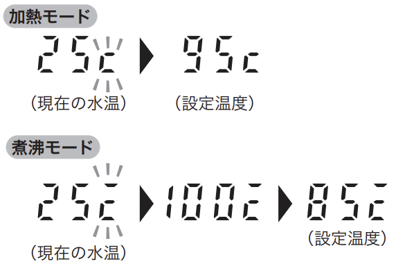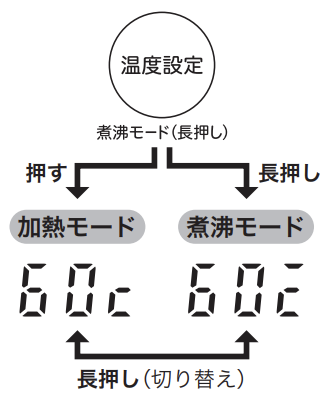 《温度設定》ボタンを長押しすると、「加熱モード」と「煮沸モード」が交互に切り替わります。