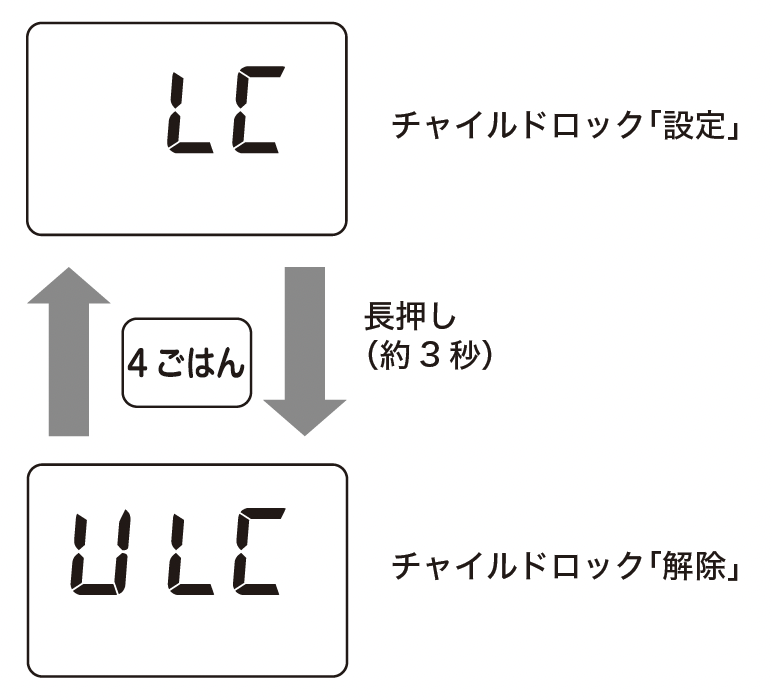 チャイルドロックが設定されています。チャイルドロックを解除するには、《ごはん》ボタンを長押し(約3秒)します。