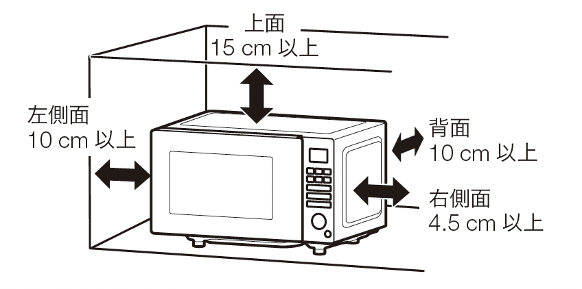火災を防ぐために、壁や家具など周囲の可燃物から下記の距離を離して設置してください。